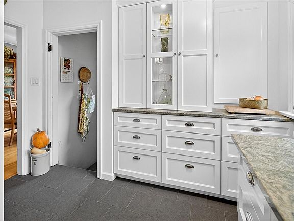 Large picture windowsArched doorsCoved ceilingsWood mantelLight slate flrWrap-around windowsPendant lights