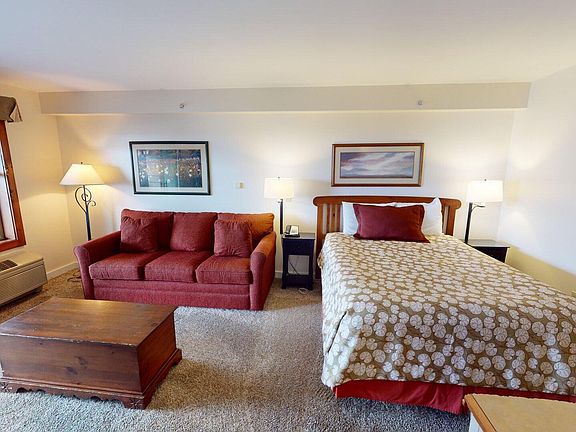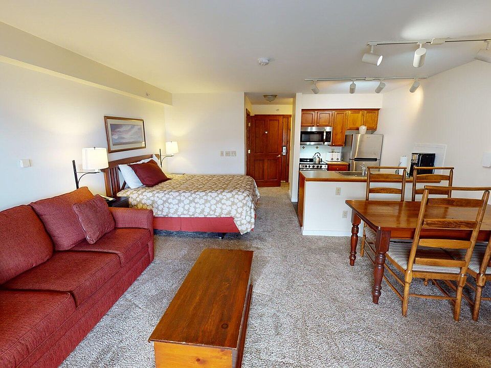 Here is a unique opportunity to own a FULL size studio in the heart of the village. This is currently the only full studio on the mountain that is available. This home is located on the top floor of Rimfire Lodge and overlooks the heart of the village. The large balcony is a beautiful place to enjoy all of the activities in the village whether it is summer time or during the winter. This full size studio has a gas fireplace, a FULL kitchen, and a cozy living space. The bathroom has a tub shower and a small pedestal sink. This home is awaiting a family to make it home. The development offers underground parking, community hot tubs, ski lockers and a sauna. HOA dues: 703.59