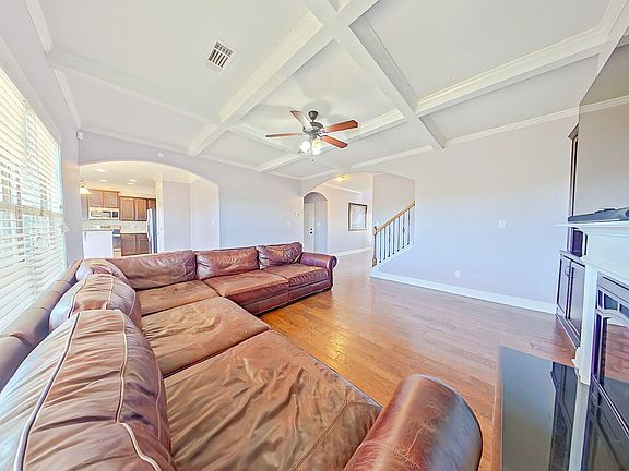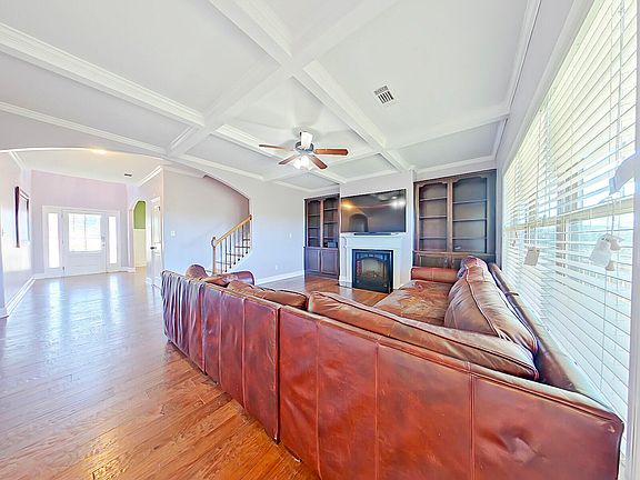 Upstairs, the loft offers additional living or workspace. The master suite features vaulted ceilings, a sitting area, and an en-suite bath with a tiled shower, soaking tub, double vanities, and two walk-in closets. Three additional bedrooms, all with walk-in closets, share a full bath, ensuring room for everyone.