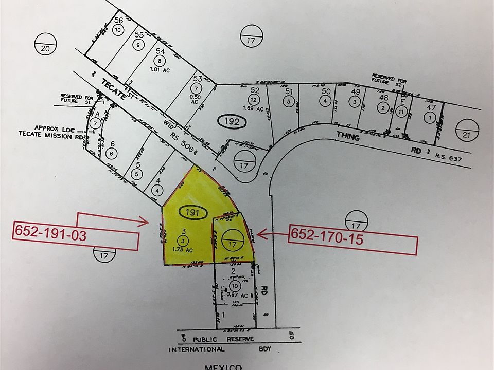 100 YARDS FROM THE MEXICAN BORDER WITH THOUSANDS OF CARS PASSING THROUGH EVERY DAY MAKES THIS LAND THE BEST AVAILABLE FOR DEVELOPMENT, A SHOPPING MALL, GAS STATION, DUTY FREE BUSINESS, ETC. THERE ARE OVER 250,000 PEOPLE ON THE OTHER SIDE OF THE BORDER. AREA WAS DESIGNATED "SPECIAL STUDIES AREA" FOR PLANNING AND RE-ZONE, MAKING IT A GREAT OPPORTUNITY TO DEVELOP THE LAND TO THE FULLEST HIGHEST AND BEST USE FOR THE AREA. LOCATION, LOCATION, LOCATION!!!!! ALSO INCLUDED IN THIS PURCHASE IS APN:652-170-15-00.