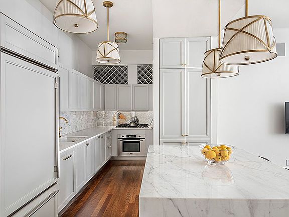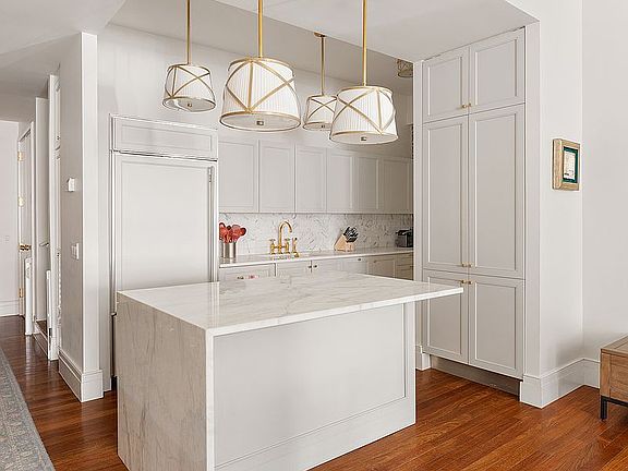 Designed for living, dining and entertaining, the spacious great room features 10' ceilings and incredible light through oversized arched windows. The open chef's kitchen boasts beautiful custom mill work providing ample storage, Sub-Zero and Miele appliances, a wine cooler, vented hood and a large marble island.