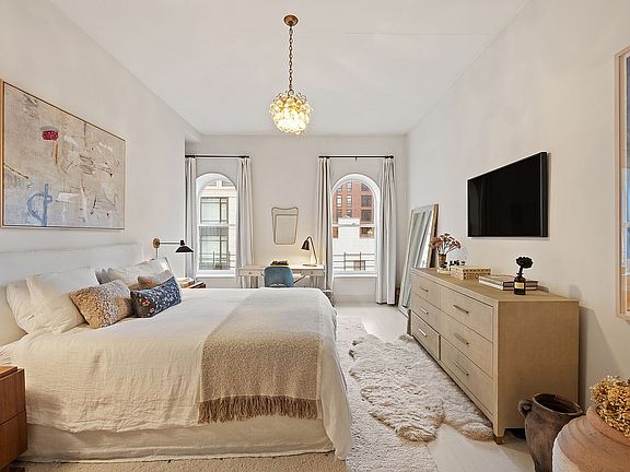Enter through your foyer into an expansive living room with room to spread your wings. Beautiful light enters from the north with open sky and subtle shades of gold from the adjacent river sunsets illuminating the rooms. High 11.5’ ceilings complement the Tribeca loft like dimensions of this apartment that retains its old world character as well its modern refinishing. The Brazilian Cumaru flooring has a beautiful white stain. A wall of built in shelving adds plenty of extra storage. Adjacent, an open chefs kitchen with top of the line appliances, pantry/vented laundry room with full size W/D, wine fridge and a large breakfast bar make entertaining a breeze. The bedrooms are split with the second bedroom opening up with sliding doors to the living room for versatility and an adjacent bathroom with tub. The impressive master bedroom has 3 custom built out walk in closets and ample room for a separate office or dressing area. The gorgeous limestone master bathroom is pure luxury with a double marble vanity, waterworks fixtures, soaking tub, walk in shower and separate toilet stall. The apartment is serviced by a multi zone central AC system with HEPA filters. Extremely quiet, this is your escape from the city.