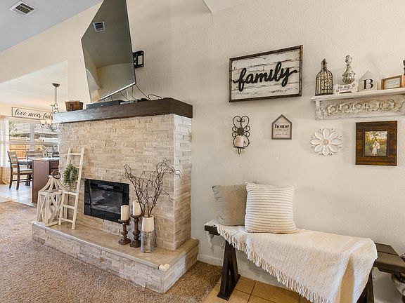 Step inside to discover a thoughtfully designed split-bedroom floor plan that provides both privacy and an open flow for everyday living. Upon entry, two spacious secondary bedrooms and a full bath are situated just off the foyer—ideal for guests, family, or a home office. The wide entryway leads into a bright and inviting living room featuring soaring ceilings and a stunning custom electric fireplace, perfect for relaxing or entertaining.