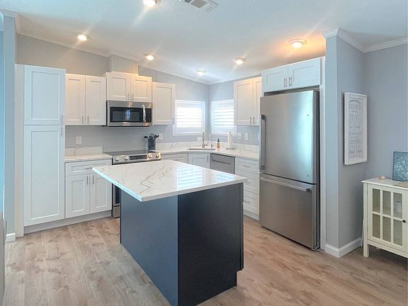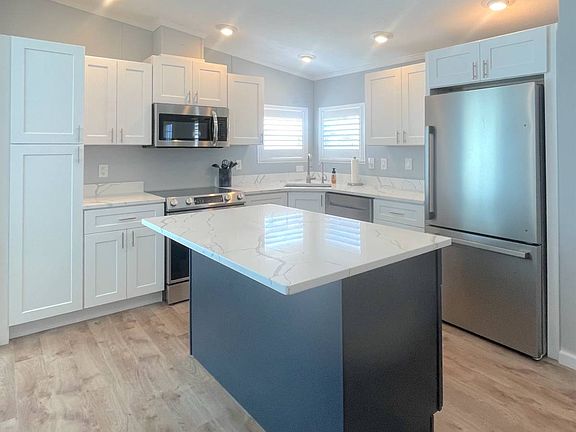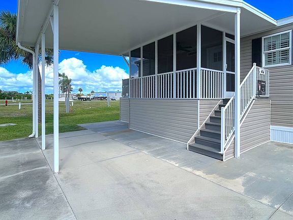 If you've been dreaming of a move-in ready beach home, look no further! This impeccably maintained 2-bedroom, 2-bathroom home is nestled in one of the area's most sought-after communities, just minutes from the sand and surf of Southwest Florida's world-famous beaches. Step inside and you'll immediately notice the attention to detail and pristine condition throughout. The open-concept kitchen and living area features quartz countertops, stainless steel appliances, and brand-new soft-closing cabinetry that elevates the space with a modern coastal touch. Natural light pours through the large slider doors and windows, beautifully complemented by plantation blinds for an upscale, timeless look. The home boasts luxury vinyl tile flooring throughout, creating a clean and cohesive flow. The spacious primary suite includes an ensuite bath with a step-in tile shower, while the guest bedroom offers comfort and style for overnight visitors. The second bathroom features a tub/shower combo and new cabinetry, ensuring every detail is polished and new. Every inch of this home has been thoughtfully updated, new roof (2023), new plumbing, new HVAC, modern interior doors, and tasteful finishes throughout. Enjoy the best of Florida outdoor living with two incredible spaces: a screened lanai with Trex flooring perfect for relaxing, and an open-air porch ideal for soaking in the sunshine. The oversized carport offers plenty of space for you and your guests. Bonus: The seller's flood insurance is transferable, providing peace of mind and added value. This home truly shines! It's pristine, modern, and move-in ready. Don't wait! Call Sweet Home Florida Group for your private showing today!