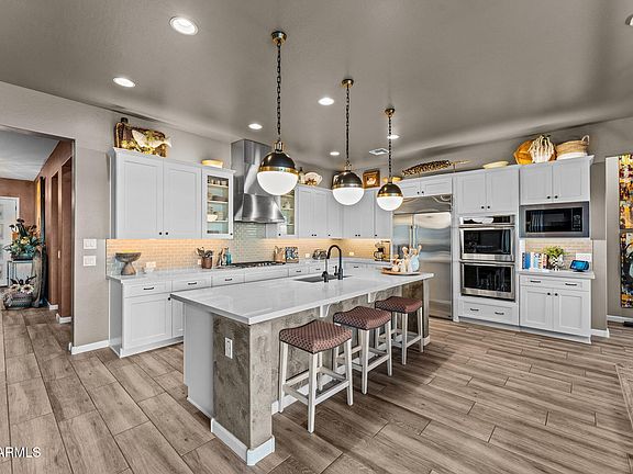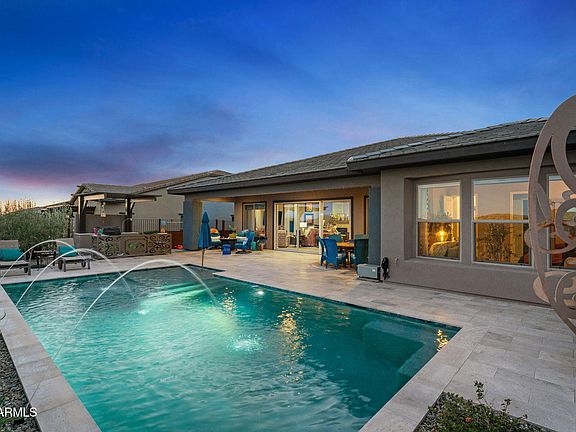 Step outside to a true backyard oasis. Travertine tiles extend throughout the entire yard, creating a clean, sophisticated look that pairs beautifully with the misting system and resort-style pool. The pool features a shallow Baja shelfperfect for lounge chairs or umbrellasand elegant arching water features that add movement and tranquility to the space. A dedicated golf cart garage completes this exceptional property, blending convenience with elevated golf-course living. Experience resort-style living at its finest in one of the most exceptional properties in all of Wickenburg Ranch.
