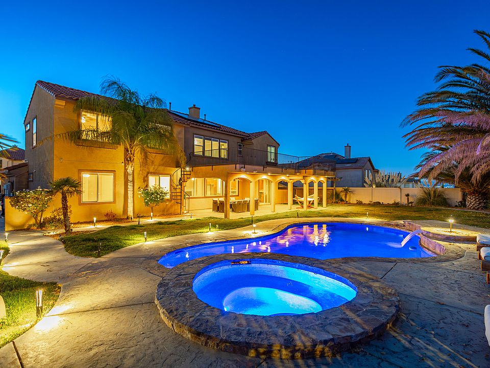 ***LIVE BEAUTIFULLY*** West Palmdale Oasis Estate w/ A Pool, Spa, RV Access, 3 Car Garage, And A Viewing Deck w/ Stunning Valley Views! NO HOA & NO MELLO-ROOS! Downstairs Junior Suite w/ A Full Bathroom. High Ceilings Upon Entrance w/ A Formal Living & Formal Dining Room. Massive Primary Suite w/ Views, 2 Walk-In Closets, And A Separate Tub & Shower. Entertainers Paradise Backyard w/ An Extensive Covered Patio, Grass Area, King Palms, And A Custom Built Pool & Spa w/ A Waterfall! Family Friendly Community! Excellent Tesla Solar Lease Currently Around $205 A Month.