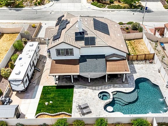 Stunning 2-Story Pool Home with RV Access, Panoramic Views & Luxury Upgrades. This Exceptional 2-Story Home Truly has it all—RV Access, Custom In-Ground Pool and Spa, and Breathtaking Views from Every Angle! Situated on a Beautifully Landscaped Lot, this Residence Offers an Oversized Paved RV Driveway with Full Hookups, a 3-Car Garage, and Dual Solar Systems for Maximum Energy Efficiency. Step Inside to Discover a Newly Upgraded Gourmet Kitchen Featuring Brand-New Cabinetry, Quartz Countertops, a Spacious Walk-In Pantry, a Massive Island with Breakfast Bar Seating, and Top-of-the-Line Stainless Steel Appliances—Including a 48'' Kitchen Aid Stove. Custom Tile Flooring is Thoughtfully Laid Throughout, Creating a Seamless, Elegant Flow. The Spacious Family Room Features a Custom-Designed Fireplace, Perfect for Cozy Nights. The Luxurious Downstairs Master Suite Offers a Peaceful Retreat with a Walk-In Closet, Ceiling Fan, Dual Vanities, Separate Shower, and Soaking Tub. The Formal Living and Dining Rooms are Beautifully Appointed for Entertaining. Upstairs, You'll Find a Large Loft, a Jack-and-Jill Bedroom Setup, an Additional Guest Bedroom, and a Full Guest Bathroom—Ideal for Families or Guests. Enjoy the Outdoors with a Newer Custom Inground Pool and Spa, a Full-Length Covered Patio, and Panoramic Views that Set the Scene for Unforgettable Sunsets. Additional Highlights Include an Indoor Laundry Room, 2 New Oversized Bosch AC Units, a Newer Water Heater, and Countless Premium Upgrades Throughout. This is More than a Home—It's a Dream Come True. Come See it in Person and Experience the Lifestyle of Luxury.