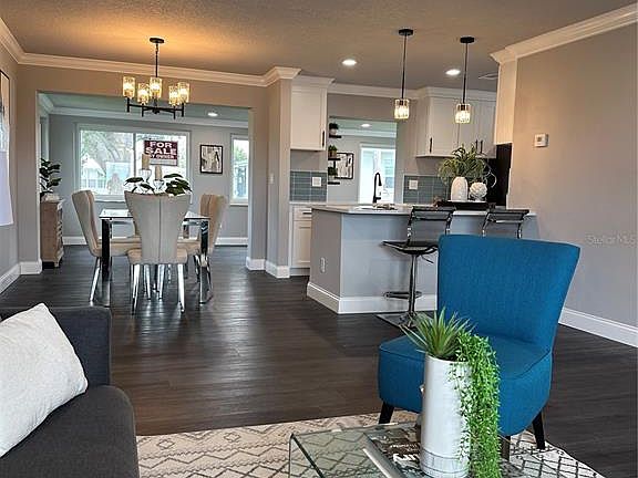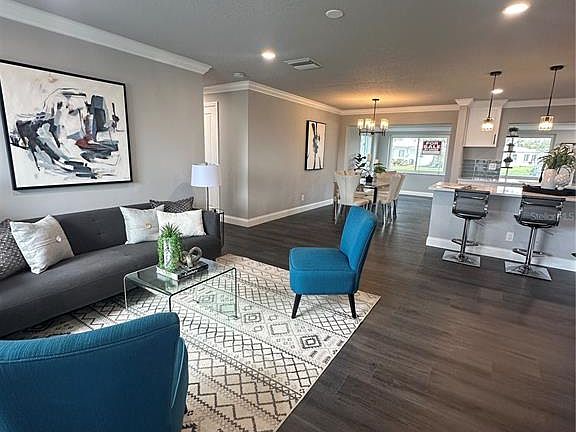 GORGEOUS! Don’t miss this opportunity. If you are looking to move into this fabulous 55+ community, take the time to come see this one in person. This home is FULL OF UPDATES! Featuring NEW luxury waterproof vinyl flooring and an open floor plan that highlights the impressive kitchen. Be the first to enjoy the new white shaker cabinets, quartz countertops, and perfectly installed classic backsplash paired with New Samsung Stainless appliances. The large sun-lit Florida room has ample space to use as you please. The dining room offers plenty of space for a holiday gathering, and the kitchen peninsula will provide more seating for your guests. Down the hall, you will find the first completely remodeled bathroom, with new tub, new vanity with drawers, new faucets, new toilet, updated plumbing, new light fixture, and an eye-catching Blue-Green Sherwin Williams color on the walls. The two bedrooms offer new ceiling fans in each, walk in closets, and all new door hardware to tie in with the rest of the home. The primary bathroom has a space-saving pocket door, new vanity, new toilet and a beautiful new shower with magnetic, flex arm for ease of showering. There is also a NEW water heater, freshly painted garage, and manicured landscaping, The “jewelry” of the home is the beautiful 5¼ inch crown molding and baseboards. This is A MUST SEE PROPERTY! Located in a welcoming community brimming with amenities, you'll have access to a wide range of activities, events, and social clubs-perfect for making the most of every day.