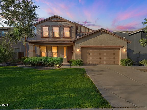 Charming 4-bedroom, 2.5-bath home in the highly desirable Morrison Ranch community is now available. This well-maintained property features lush front landscaping, a welcoming front porch with a swing, and a 3-car tandem garage. Inside, you'll find a formal living room, spacious eat-in kitchen, and a large upstairs loft perfect for a second family room or entertainment space. The kitchen includes black appliances, plenty of cabinetry, a pantry, and a center island. The primary suite features a separate shower and soaking tub, dual sinks, and a walk-in closet. The backyard is ideal for entertaining with a covered patio and extended paver area. Don't miss the chance to make this beautiful home yours. Seller offers a $5500 credit to buyer for carpet replacement.