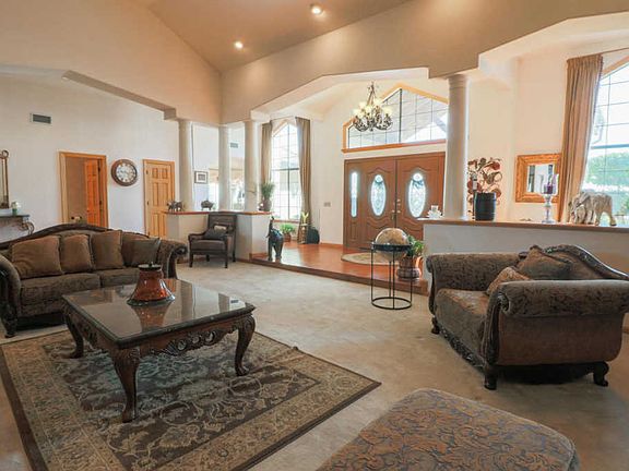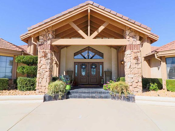 Paradise welcomes you up the circular driveway To this custom single story. RV access allows for multiple RVs or other vehicles. Brilliant architecture enhances the appeal in addition to pleasant plants & rock landscape. Enter through custom oak double doors to find light shining through multitudes of windows across real hardwood floors & onto custom wood window sills. Entry overlooks the impressive step down living room. A massive dining room features elegant draperies & luxurious chandelier. Kitchen is adorned with granite counters, upgraded cabinets, brilliant backsplash, high end custom fridge, double oven, built in microwave, wine fridge, massive sink, center island with separate sink, a cooktop & stainless steel appliance. Warmth exudes from 3 fireplaces. 2 master bedrooms. Continue