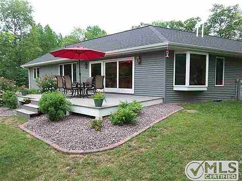 Beautiful 3 bed, 2.5 bath home set on rolling, wooded 3 +/- acre parcel. Kitchen hosts maple cabinets and a large breakfast bar. Cathedral ceilings & gas fireplace in the great room overlook the large back yard. Maple hardwood floors in living room, kitchen, dining area, 14x20 Trex deck off kitchen/dining area. Master suite, 24x24 2-stall garage and 12x34 3rd stall. Partially finished basement, family room w/option for additional bedroom/bath/office area. Tons of storage. Check it out! Brokered And Advertised By: WILD RIVERS REALTY-F Listing Agent: GLORIA NAJERA