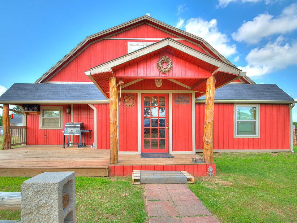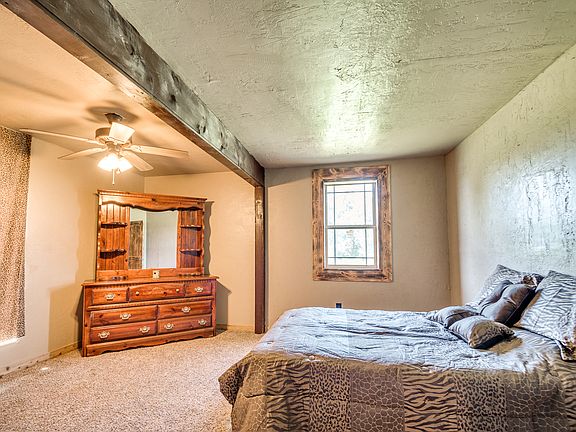 Truly a one of a kind piece of real estate, located in Tecumseh!! GREAT LOCATION, GREAT VIEWS ALL YOU NEED IN ONE LOCATION….. A 3816 sq. foot custom designed features throughout the house, from wood ceilings, custom built ins, doors to the concrete floors throughout the main level. The seller has thought of everything when it comes to maximizing the spaces and the finishes. There are a few opportunities to put your personal touches still on this home. The downstairs bath has a vessel sink and walk in shower, and leads into a storage area perfect for his and hers closets! The downstairs utility room is oversized for any overflow storage needs or double washer and dryer. The family room is large with an electric fireplace and built in for your television. You will notice throughout the house the oil rubbed bronze lighting fixtures that add additional touches any homeowner will love. The home boasts both upstairs and downstairs oversized entertaining areas, large dining room that will accommodate the largest of tables!! Grab a cup of coffee or a good book and retreat upstairs to the private nook with a great picture window to enjoy the view as well. If entertaining is a must, you can entertain upstairs with several different areas all grounded by a wood burning stove and large windows letting in plenty of light and the great views!! Posts are set for the outdoor 120*240 arena, along with fully erected round pen that is located beside your own tack and feed outbuilding. There are dog pens and outbuildings alongside the arena for easy access. Everyone home should come with an underground storm shelter and this one does with plenty of room for all the family and the pets as well. These 10 acres are completely fenced and crossed fenced perfect for either cattle or horse and a pond on the back corner will allow for you to have water to the back pastures. Walk out your front door to enjoy the peach, pear, plum and mulberry trees. This property has two septic tanks and two water meters so additions will be easily made. All of this is located behind a custom Iron Gate, 3 security lights and alarm system.