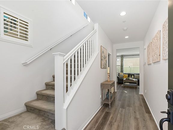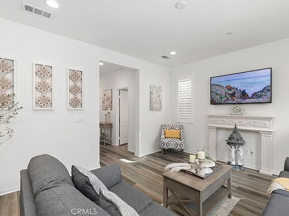 Discover a world of refined living within the prestigious and newly established Bedford gated community. This impeccable residence, boasting less than two years of age, presents itself like a model home. Encompassing 3 bedrooms+ Loft, 2.5 bathrooms, 1,792 square feet of interior living space, a 2-car garage and a 3,049-square-foot lot, this home is move in ready. Upon entry, a formal foyer sets the tone for the luxurious journey that lies ahead. An inviting family room bathed in natural light captures your attention with wall-to-wall windows, seamlessly merging with an exquisitely designed kitchen. The kitchen upgrades include taupe brown cabinetry with molding, granite counters with breakfast bar, a farmhouse sink with a voice-activated faucet, stainless steel appliances, and enhanced pendant lights. Elegance extends to the dining room, graced by a captivating chandelier, extended cabinetry, a granite counter and custom floating shelves. A French door opens to the serene backyard, forging a connection to the outdoors that is both inviting and harmonious. A powder room completes the main level's offerings. Journeying upstairs, you'll find a sun-soaked loft adorned with a stylish chandelier, two guest rooms, a laundry room and hall bath, complete with a dual vanity, quartz countertop, and shower in tub. The primary suite is an embodiment of elegance, with wall-to-wall windows creating an airy and illuminated retreat. A spacious walk-in closet meets your storage needs, while the ensuite primary bathroom indulges with his-and-hers sinks, a quartz countertop, and a walk-in shower. Within, discover additional interior features, including solar panels, a tankless water heater, recessed lights, sleek gray vinyl plank, ceramic tile, and plush carpet floors, designer window shutters and treatments, upgraded baseboards, panel doors with custom frames, ceiling fans and more. The backyard experience has not been overlooked. Step outside to a serene and enchanting haven offering a concrete slab, artificial turf, and lush planter area adorned with a harmonious assortment of trees, shrubs, and a soothing waterfall. Beyond the home, revel in the resort-style amenities offered by the Bedford community. Enjoy access to pools, spas, a clubhouse, parks, walking and hiking trails, BBQ areas, fire pits, and sport courts. Nearby, the 15 Fwy, Glen Ivy, and Dos Lagos Golf Courses beckon, while The Shops at Dos Lagos and Crossings at Corona provide shopping and dining delights.