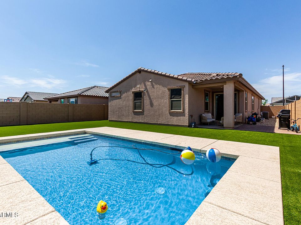 Welcome to Warner Meadows! This stunning single-level home is perfectly situated on a premium lot w/no neighbors behind, backing to a scenic greenbelt & walking paths for added privacy & serene views. Inside, the home features 5 bedrooms & 3 bathrooms w/an open, bright floor plan designed for both comfort & entertaining. Highlights include quartz countertops, stainless steel appliances, a gas range, raised panel doors, & soaring 9-ft ceilings w/8-ft doors T/O. The spacious primary suite offers a walk-in closet, double vanity, & a large walk-in shower. Step outside to your newly built play pool & low-maintenance backyard w/turf & a covered patio—perfect for relaxing year-round. Residents of Warner Meadows enjoy a fantastic community lifestyle w/ameniti es including a resort-style pool, fitness center, playground, biking and walking paths. Located just steps from the community pool and parks, and minutes to the Epicenter, Topgolf, SanTan Village, the new Cannon Beach retail park, and exciting attractions along South Power Road.