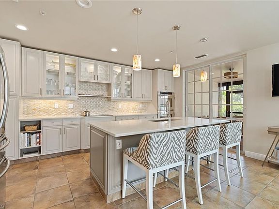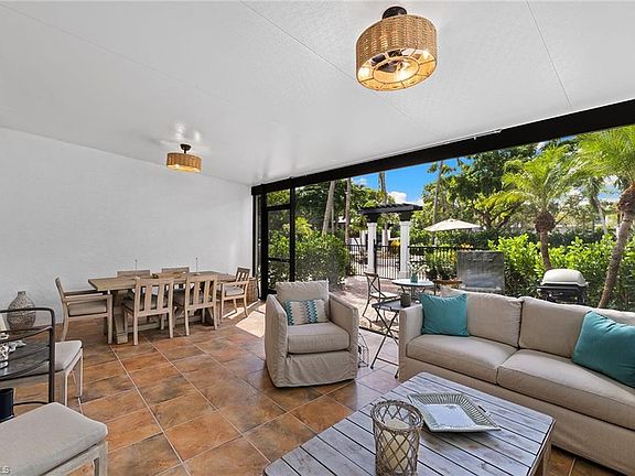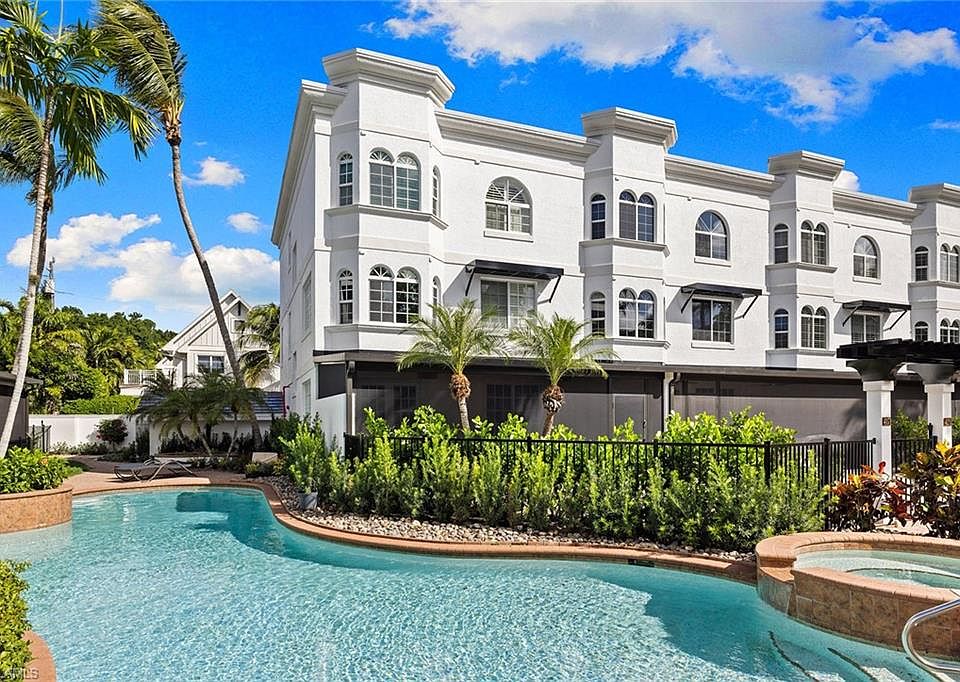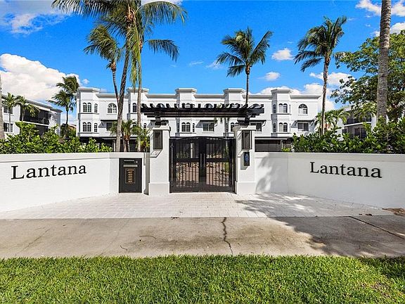 This four-bedroom, three-story attached villa in Lantana offers a rare opportunity to own one of only two end units in the community. Just one block off 5th Avenue and three blocks from Naples white-sand beaches, the home enjoys abundant natural light, privacy and an exceptional location. An updated, open kitchen with large attached screened lanai lends itself to leisurely dining and entertaining. There is a powder room on the main level. Designed for flexibility, it features dual primary suites, one on the second floor with a walk-in closet, en-suite bath and in-suite laundry, and another on the third floor also with walk-in closet and en-suite bath. There are an additional two guest bedrooms and full bath creating a private guest level with their laundry room. Additional highlights include a two-car garage, private elevator, whole-house water filtration system, and updates such as new HVAC system (2019), new roof (2025) and newly updated garage door opening system (2025). Sold furnished, this residence is move-in ready. All Lantana units and garages have remained dry through past storms, according to the owners, and offer lush gardens, two pools and two spas, all within a peaceful tropical setting just a short distance from 5th Avenue and the beach.
