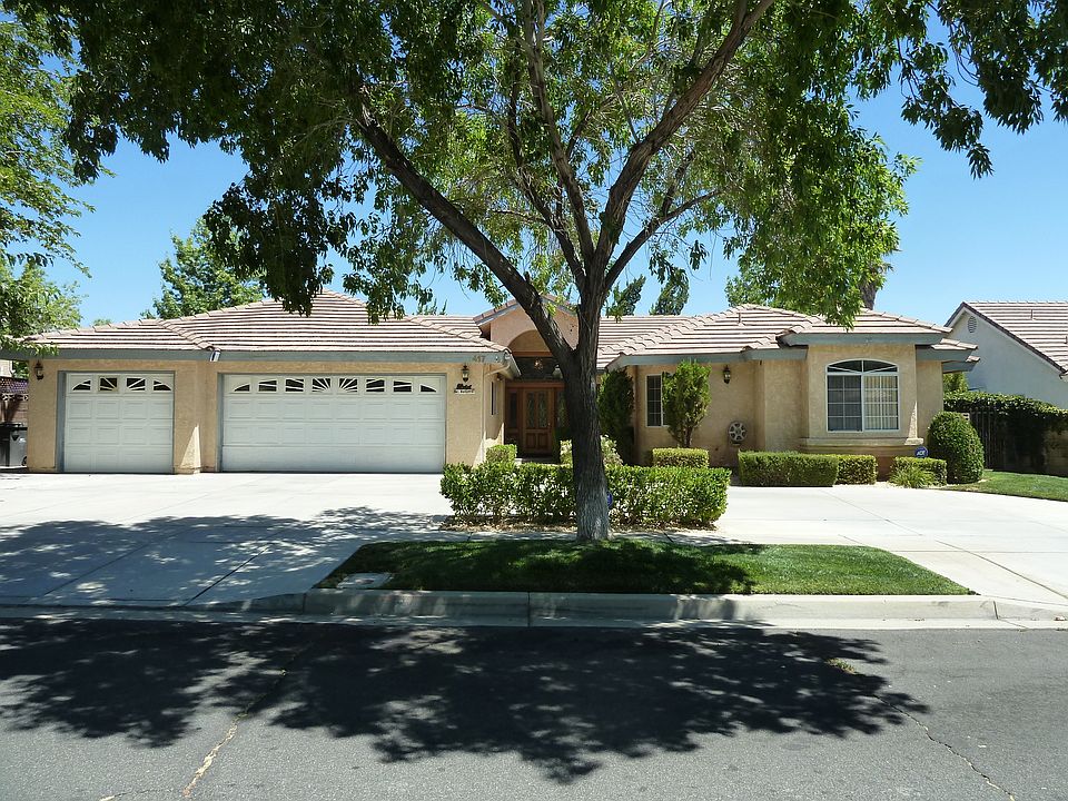 Fantastic West Palmdale Country Club Home, This 4 bedroom 3 bath home is over 2700 square feet. As soon as you drive up you see custom quality circular drive way and new custom wrought iron doors. This single story home has a great floorplan starting with a large living room, separate formal dining room, and a large family room right off the newly remodeled kitchen with new stainless steel Kitchen Aid appliances, granite counter tops and lots of storage, also has a walk in pantry and custom recessed lighting throughout. The Master suite features 2 walk in closets, custom tub and separate shower and quartz counter tops with double sinks, The back yard features block walls and a covered patio. Other great features are a large 3 car garage, a spacious laundry room with built in cabinets, and custom ceiling fans.