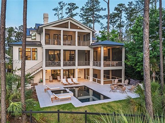 Known to visitors as The Marsh View House, 417 Corley Street is a five-bedroom, six-and-a-half-bath three-story home in Moreland Village with exquisite indoor-outdoor living and solid revenue history on the short-term market. Wrapped by its namesake views, the homes expansive 4,834 square feet offer a wealth of spots for family gatherings, whether around the pool in the covered patio or among the refined elegance of its second story living spaces. Crafted by Full Circle Construction from a KRA Architects design, the homes tri-level structure gives each level of the home a purpose of its own. On the first floor, flanked by a two-car and one-car garage, a roomy game room incorporates sliders that open wide to the covered porch. With a separate screened porch to one side, this outdoor oasis includes a gas starter wood fire pit, pool, spa and marsh views framed exquisitely by Jackson & Small-designed and fenced landscaping. The main floor, accessed by a dramatic double entry stair, flows around an open concept living and dining room, with gas fireplace at one end and expansive kitchen, with custom hood above a gas range, at the other. Between, a coffered ceiling guides the eye out to a massive elevated power screened porch with outdoor kitchen overlooking the marsh. Along one wall, a nook opens to reveal a bar perfect for entertaining, adjacent to a separate coffee and preparation area. The entire living area opens up by a power five panel sliding door to the outside. The third story, host to three full suites each with private baths, a bunk room, and elevated loft, enjoys its own private balcony as well as an elevated screened porch. A three-stop elevator connects them all. Along with the top-floor suites, a further full suite can be found on the main floor or act as an office/library, along with the lavish primary suite. An entire wing of the home to itself, this grand space incorporates a private laundry, serene bath with walk-in shower and soaking tub, massive his-and-hers closets, and breathtaking views across the marsh.