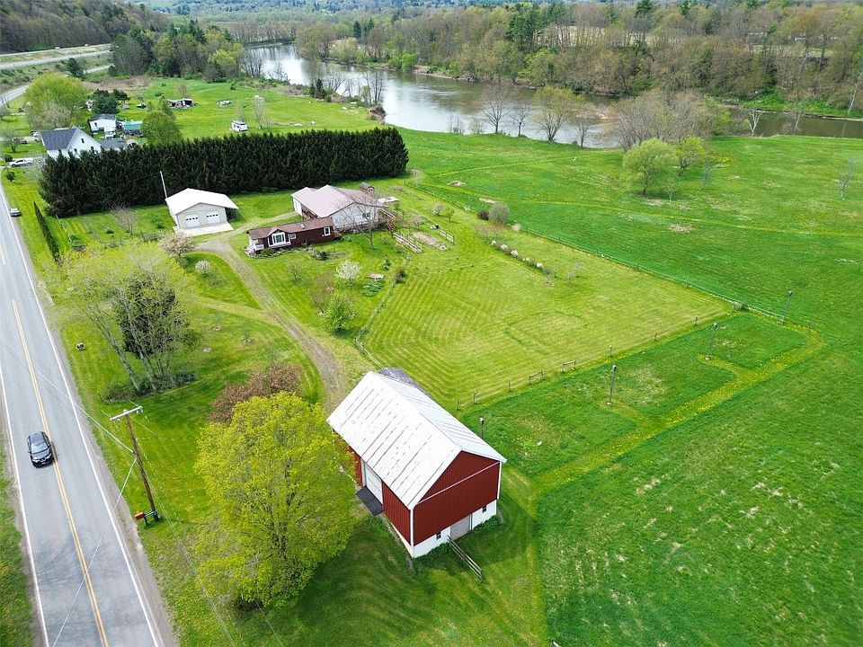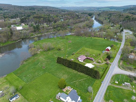 RARE FIND! 14 acres in Chenango County NY bordering the Susquehanna river. Fish or kayak from your own land! An immaculate sparkling 1 bedroom/1.5 bathroom ranch home built in 2018 with 2 x 6 construction. A full basement can be finished for more space. HE central heat and air. Boasting a gorgeous open interior w/a welcoming foyer, beautiful floors, spacious living & dining areas, and a kitchen w/stunning butcher block counter space impressive enough for a gourmet chef! A spa-like bathroom w/an enormous walk-in closet. Two 12 foot sliders open to the composite deck overlooking the property. The deck wraps around & leads to the 700 sq. foot one bedroom one bath cabin. Home is wired for generator. Fruit trees; peach, pear, plum, cherry, apple, raspberry. The 40 x 32 pole barn installed in 2016. A 2nd two level barn that has newer siding, a remote door, horse stalls, office, electric, & water. Two storage sheds. Easy to see, don't miss this opportunity for some country serenity!