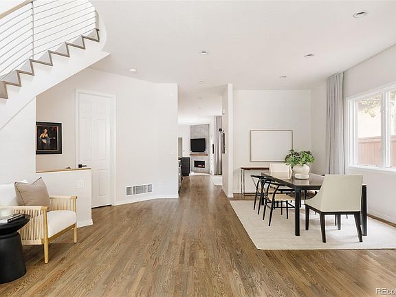 Stunning contemporary residence where modern design meets timeless warmth. Updated with stylish finishes & an inviting layout, this home offers the perfect blend of functionality & comfort. Inside the expansive open living spaces are filled with natural light, hardwood floors & soaring ceilings. The front sitting room features arched windows letting in plenty of light. A striking staircase with sleek metal railing adds a modern architectural focal point. Just off the entryway you will locate the dining room. The chef’s kitchen is a true centerpiece, showcasing sleek high-gloss cabinetry, quartz countertops, Wolf gas range & an oversized waterfall island with seating. A dedicated built in bar with floating shelves, wine refrigerator & marble-inspired backsplash creates a perfect space for entertaining. Additional built-in cabinetry provides a clean, modern workspace & extra storage. Just off the kitchen you’ll find an additional sitting space as well as the main living room which offers a cozy retreat with accent lighting & a fireplace wall with floor-to-ceiling stone tile. The sliding door opens to a private courtyard-style patio surrounded by mature trees & privacy fencing - the space is designed for effortless outdoor entertaining. Upstairs, the expansive primary suite is a private haven with vaulted ceilings, plenty of space for a sitting area & a cozy fireplace. A large walk-in closet with built-in organization offers ample storage. The en-suite bath features dual sinks & a spacious glass shower & soaking tub. An additional bedroom & a bathroom is located upstairs along with a convenient laundry room with built-ins & a spacious linen closet. Step down to the finished basement to discover a large living space & an expansive unfinished storage space. Walkable to all the shops & dining that line Cherry Creek, this home offers the best of both convenience & community. Tree-lined streets, nearby parks & inviting outdoor spaces create a serene residential setting.