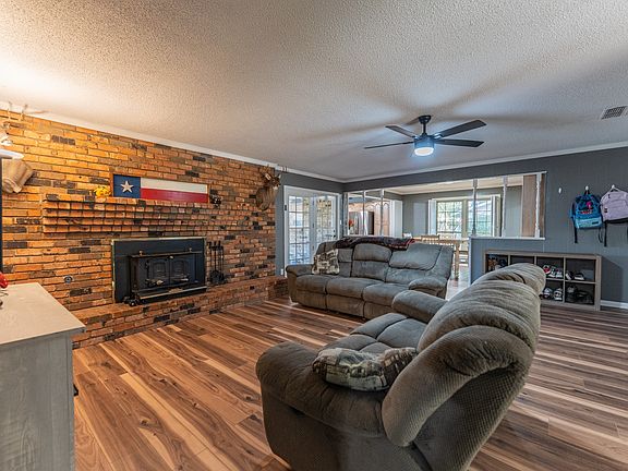 Brick wood-burning fireplaceSpacious dining areaPatio windowsSmooth-top range with stoveBreakfast barLarge privacy-fenced backyard