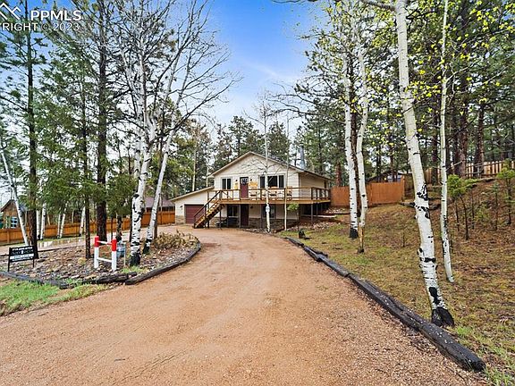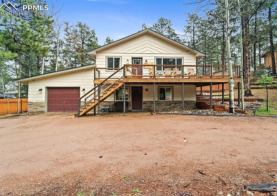 Discover your perfect retreat in the tranquil Woodland Hills subdivision of Woodland Park, Colorado! This fully furnished and updated home eagerly awaits your arrival. This property encompasses a picturesque circular driveway, a spacious fully fenced backyard, a convenient shed, and a large dog run seamlessly connected to the garage through a dog door. As you step onto the newly installed wrap-around deck, anticipation builds, leading you into the cozy living room, adorned with a charming wood-burning fireplace. The pass-through kitchen is a culinary haven, equipped with an array of large and small appliances, along with an abundant supply of dishes, cups, and glasses. The kitchen effortlessly flows into the inviting dining room, fostering a warm and welcoming atmosphere for gatherings and memorable meals. Indulge in luxury within the primary bedroom, boasting a beautifully updated en suite and a spacious walk-in closet complete with smart wooden built-ins. The second bedroom offers a walk-in closet and shares the delight of a newly renovated full bathroom. For added convenience, a separate entrance on the lower level invites you into a generous living room, furnished with a TV and entertainment center. Stay cozy next to the reliable pellet stove and enjoy the convenience of a sturdy dry bar. The lower level expands the possibilities with two additional bedrooms and another full bathroom. A flexible room, currently arranged with bunk beds, provides versatility, while the full-sized washer and dryer conveniently lead to the oversized one-car garage. Numerous upgrades have been lovingly incorporated. Your mountain escape awaits, ready for you to move in and embrace a life of comfort and serenity. Don't miss this extraordinary opportunity to make this meticulously designed and furnished home your very own. It's time to start your next chapter in this remarkable haven!