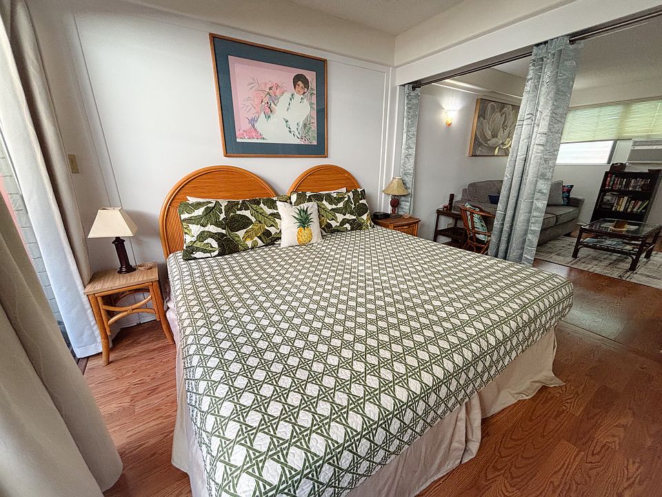 Our unit features one bedroom, separated from living room by curtain room divider, great closet space, full kitchen, breakfast bar, private lanai with outdoor seating, desk/chair, A/C, tv, wifi, and cable. Not to mention, down below in the Hawaiian King courtyard, escape the hustle & bustle and take a dip or sun bathe by the beautiful pool!