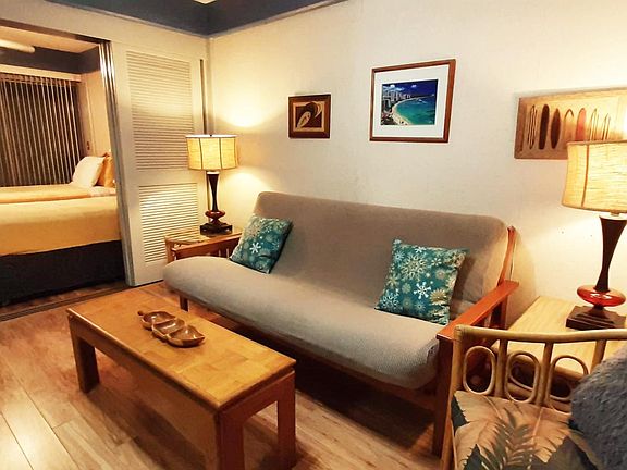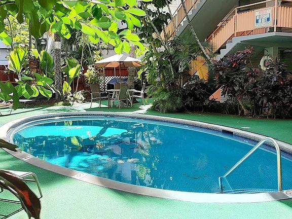 Email or text me for viewing appointment (please include move-in date and desired rental term). Central Waikiki location on most convenient block - across from International Market. Hawaiian charmed garden complex w/ a lovely pool. BBQ grill available by the pool. Fully furnished, sparkling clean 1 bedroom unit (488sf interior +80sf covered lanai) in a charming Hawaiian Garden complex. Fully equipped kitchen, Wifi, cable TV included in rent. * Monthly sublet (for immediate occupancy) with possible extension. * $1499/Month for 1st month (single occupancy) * Longer or shorter rental possible under different terms. * Reserved parking in secured garage available. * Fully furnished unit including complete bedding, towels, kitchen essentials * Most utilities included (Water/Cable/Wifi) * This sublet is rented at AS-IS condition