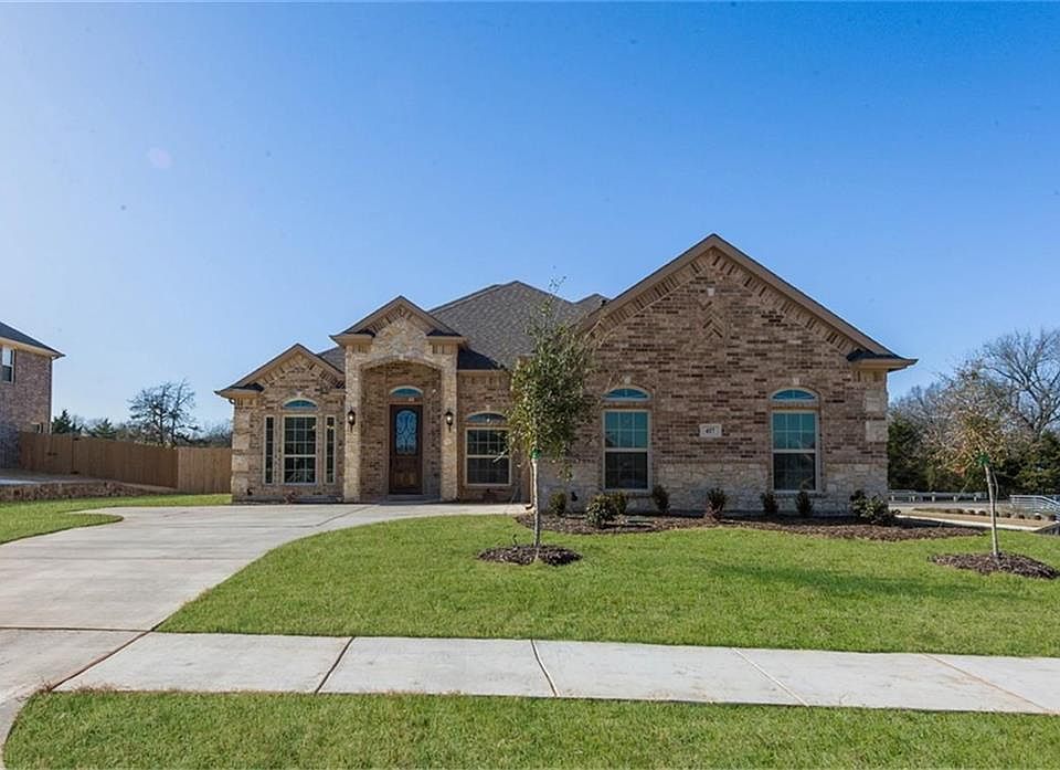 MLS# 13976991 - Built by First Texas Homes - Ready Now! ~ Beautiful One & half story home w-stone arch. Inside has lovely wood floors in entry, family room and formal dining. Granite countertop, ceramic floors, California kitchen island, 5-burner cooktop, double oven, staircase w-rod iron railings, media room upstairs w-surround sound & shower, jetted tub in master bath, radiant barrier decking, gutters, full sod front & back, tankless water heater and more!