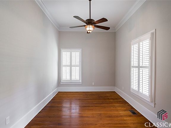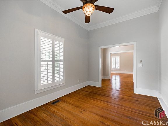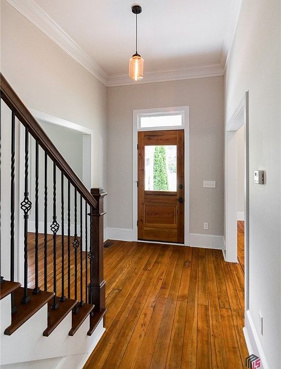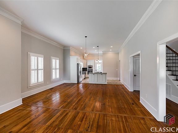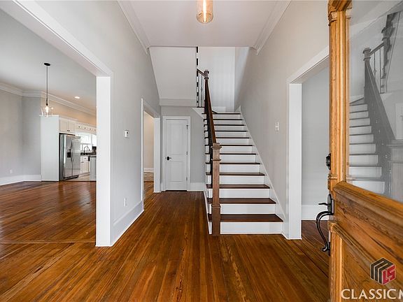 This 1920s farmhouse in Social Circle combines historic charm with modern upgrades. Original hardwood floors, wooden corbels under the eaves of the front porch, and a beautiful, intricately carved wooden front door with antique glass seamlessly blend with the modern renovations. The open floor plan of the main level showcases the custom-designed kitchen that flows into a spacious dining area and a great room, with soaring ceilings and beautiful windows all around. The kitchen features granite countertops, tile backsplash, copper farmhouse sink, walk-in pantry and stainless steel appliances. The primary suite boasts a large walk-in closet, clawfoot tub, double vanities, and a walk-in shower with a rain showerhead. Also on the main floor is a secondary bedroom with an ensuite bathroom and walk-in closet. There is a room at the front of the home perfect for a home office, library, or playroom. The original grand stairwell will take you upstairs to a landing area, ideal for a window seat or a small desk, and two bedrooms with a jack-and-jill bathroom. The exterior features a wraparound porch, stamped concrete driveway, and a back deck overlooking a huge, flat backyard. Upgrades include molding, pendant fixtures, recessed lighting, granite in the bathrooms, French drain system and an encapsulated crawlspace. Located within the historic district of Social Circle, sidewalks will take you to a coffee shop, restaurants, and retail around the town’s famous well. Or you can hop on your golf cart and head right up the street. Easy access to I-20 for a commute. Immaculately preserved historical charm, contemporary finishes with modern renovations, and a desirable downtown location, you don’t miss out on claiming this piece of history as your own. There is nothing else like this on the market!