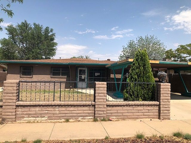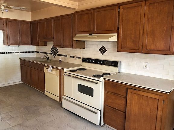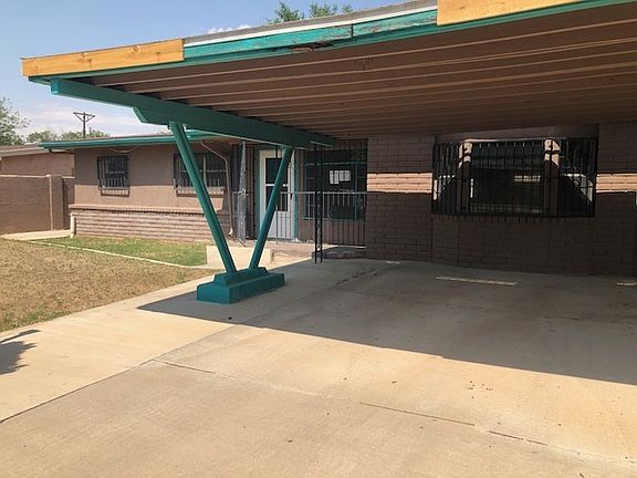 Large spanish style hacienda has 2 living areas. Family room has vegas, kiva frpl, built in cabinetry and wood floor. Kitchen is large with wood cabinets. Large back patio. W/D hookups and HWH are in the room off the back patio. There is a large detached double garage. The fence is block with stucco and wrought iron. There is also wrought iron on the windows. House needs work but priced to sell. Owner occupant bids only for 10 days.