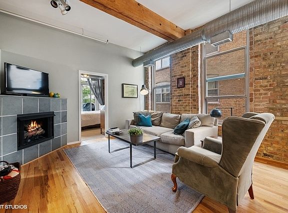 Bright and spacious 2 bedroom 2 bath West Loop condo in elevator building with private balcony. Situated in the Gotham Lofts, this unit comes with two fully enclosed bedrooms with the classic exposed brick, spacious ceilings and timber accents of a Chicago loft. 1 heated and attached garage parking space included in the price. Building amenities include a rooftop deck with amazing views of the Downtown skyline, large storage locker, gym and bike room. This well appointed home features an open kitchen, living room and dining room space with a gas fireplace that creates a warm and inviting space for entertaining and relaxing. Ample storage and closet space with in unit washer dryer. Both fully enclosed bedrooms come with ample closet space including an oversized walk in closet in the primary. Primary bedroom also includes an ensuite bath and private balcony. Second bedroom looks out onto quiet tree lined building courtyard. Ideal for designated office space or nursery. Situated for an easy walk to the Loop, West Loop, H Mart, public transit and access to 290 / 90. Seller offering a credit to paint the kitchen cabinets.