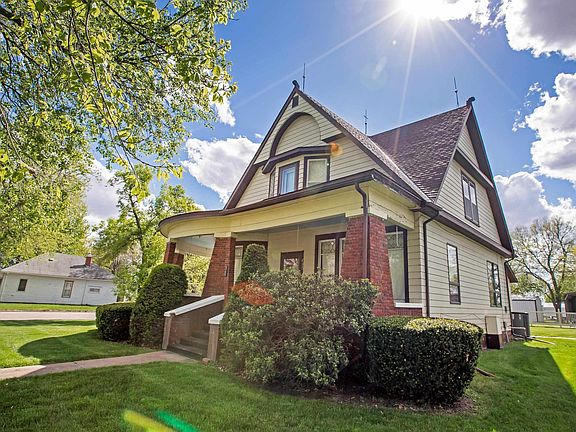 This beautifully maintained home is situated on a large corner lot with tons of curb appeal. Out front is a wraparound front porch with landscaping and a bay window on both floors. Behind the house you will find a detached garage, deck, and a partially fenced in backyard. The main floor features intricate detailed woodworking throughout, a fireplace, kitchen, dining room, family room with pocket doors, living room, laundry room, bathroom, high ceilings, and plenty of storage. Upstairs there are three bedrooms and a bathroom. The unfinished basement is perfect for storage.