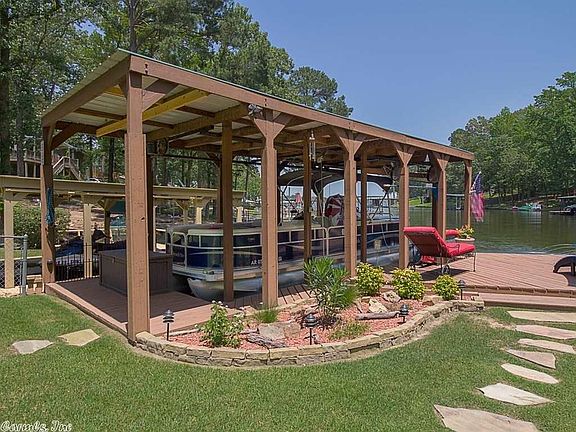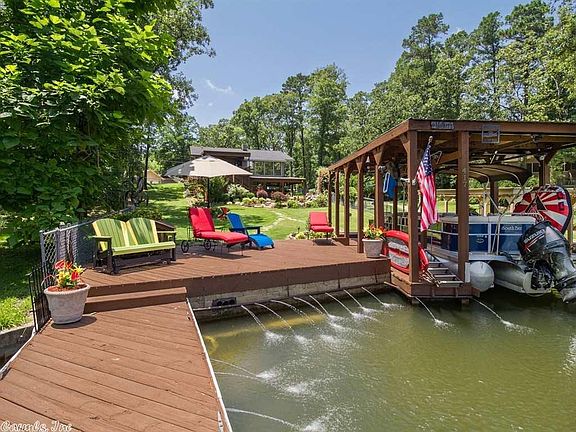 Great views!! 2 Br. 2Ba. brick Lake Hamilton home with year around water, including covered boat dock with 6000 lb lift, and swim dock. Has great open floor plan updates include granite counter tops, new kit. cabinets, appliances, updated baths and more. Extra features include gas fireplace, outdoor kitchen, beautiful gas fire pit, gorgeous water feature, spacious deck, plus lots of storage in basement. Lakeside Schools.
