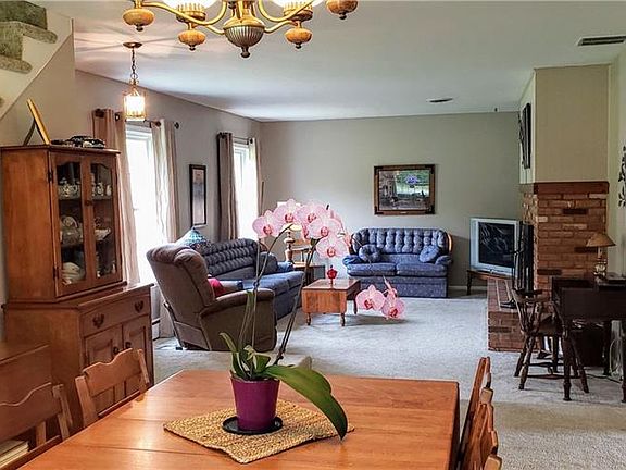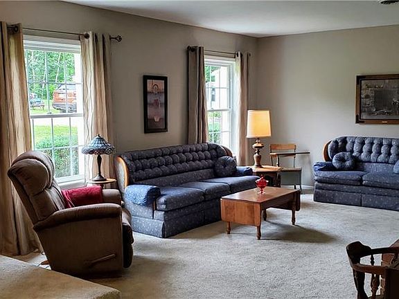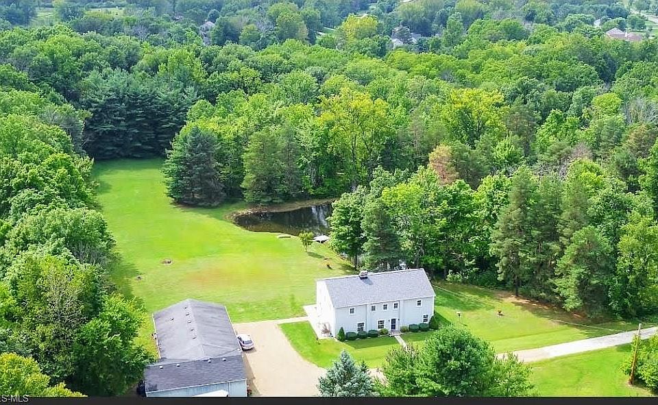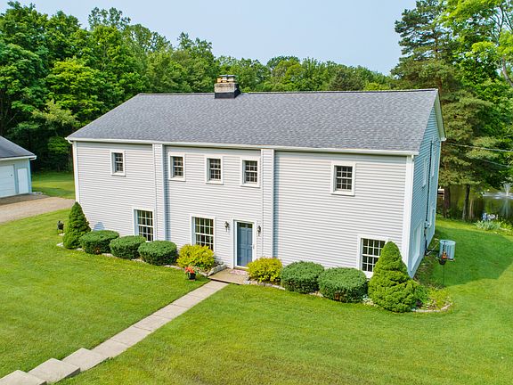 5 bedroom, 2 ½ bath Colonial on 10+ wooded acres with a pond. Living Rm w/brick wood burning fireplace. Dining room w/large picture window with window seat. Updated kitchen with wood cabinetry, some appliances stay. Family room w/brick hearth and woodstove insert, Dutch doors lead to rear patio. Hardwood floors under most carpet! Large heated, garage/outbuilding w/ a 24 X 40 4 car bay, 32 X 48 car bay & workshop. Additional 20 X 26 storage building. Free gas on property. Public water available at street.