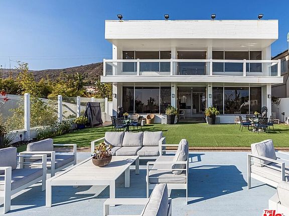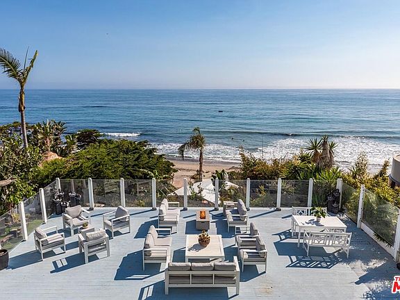 This 5-bedroom, 5-bathroom beachfront estate spans over 4,500 square feet and was designed by renowned architects Buff and Hensman for legendary musician Miles Davis. Set on appx. 1/3 acre along a secluded stretch of western Malibu coastline, this privately gated property offers uninterrupted ocean views and direct access to the sandy beach below combining privacy with a rare connection to the shoreline. The heart of the home is a spacious living room with soaring ceilings, a statement fireplace, and walls of glass that frame the ocean beyond. Adjacent to the living area is a dining space with a pool table, offering a relaxed yet sophisticated setting for entertaining. The expansive primary suite features a sitting area with second fireplace, a private beachfront deck, and a bathroom with a sunken tub overlooking the Pacific. The additional three guest bedrooms include en-suite bathrooms, while the chef's kitchen opens to a wide oceanfront deck that spans the width of the home. Designed with multiple sitting areas for dining, lounging, and gathering, the deck connects seamlessly to the interior, creating an effortless indoor-outdoor flow and panoramic views of the coastline. Blending timeless architecture with refined coastal living, the estate also includes three fire pits, a landscaped backyard, a beachfront gazebo, and benches placed throughout the garden paths. Located within walking distance of Neptune's Net Seafood Restaurant and just six miles from Trancas Country Market, this retreat offers a rare combination of seclusion, accessibility, and lifestyle. Surfing at County Line, swimming, boogie boarding, kayaking, kite surfing, and paddleboarding can all be enjoyed right in front of your beachfront home along with breathtaking ocean sunsets.