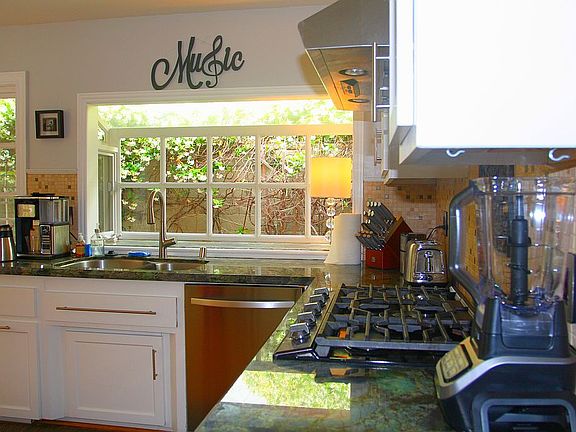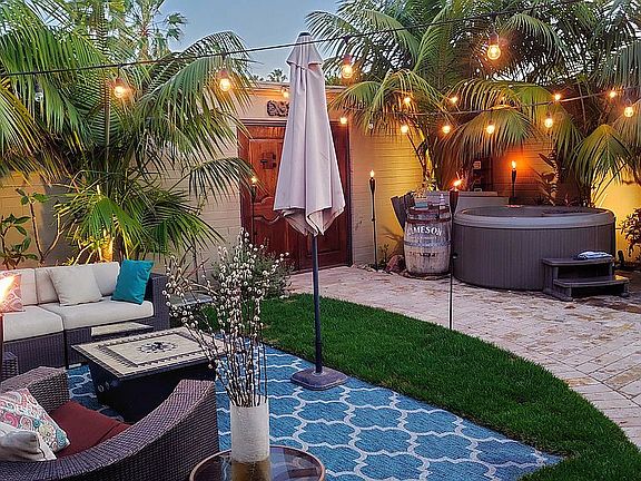 Enter the large front doors and an open space awaits you. The living area is a great room where the kitchen, dining, and living room all flow together in space perfect for socializing, cooking, and entertainment. Attached to the living space is a bedroom featuring glass French doors to the courtyard, inviting cool ocean air and a queen size Murphy bed to relax upon. A Jack and Jill bathroom with a large shower, built in Bluetooth speakers and skylight connects a bedroom with French Doors room to another guest room. An extra skylit music themed half bathroom with built in Bluetooth speakers is located in the hallway. At the end of the hall lies the master bedroom featuring many windows to the tree lined private back yard for you to grill your summers finest foods as fountains give the ambiance of peace and flowing waters. The master bathroom is Greek tiled with a soaking tub and separate shower with Bluetooth speakers to rock out while you shower.