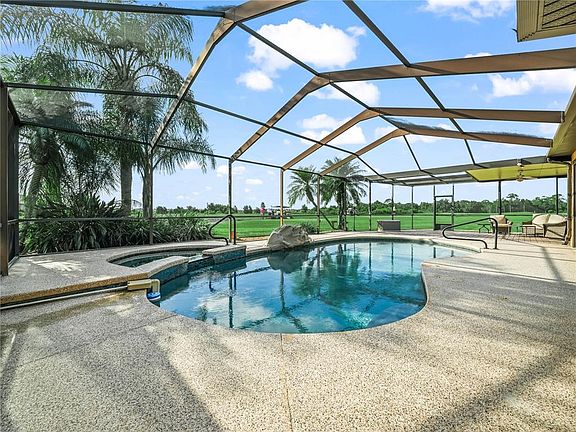 This is a MUST SEE charming RV POOL HOME with HOT TUB overlooking the GOLF COURSE with WATER VIEWS! Ideally situated in Lake Ashton, a Florida premier 55+ guard gated community tailored to include RV enthusiasts looking for resort style amenities and activities, this home has a spectacular golf course view (West Course- 18th Hole) & water view beyond. You'll enjoy the added benefit of no rear neighbors. This EXPANDED Coronado Floor Plan Home with 2 Bedrooms, 2 Baths, Office & Florida Room with A/C and Roll Down Shades is enhanced by extensive upgrades and offers over 2,200 sq. ft. living space and 3,867 sq.ft. under roof. The fully enclosed supersized RV Garage with Insulated Garage Doors, Automatic Garage Screen, Tiled Floor, Extra Golf Cart Garage Door Entrance, Generously Sized Workshop Space in the rear of the RV garage and Loft area with Stairs is a MUST SEE. The RV GARAGE IS 14'8" x 56 and it's attached to a 2 Car Garage. The RV Garage is high enough for a car lift. A separate entry door was added to the Extended RV Garage Space on the front of the home. Upon arrival at the home the external curb appeal with Stone Accent, Paver Driveway, Side of the Home Paver Walk Way, Mature Landscape with Rock and Poured Curbing, Awning on the Guest Bedroom and Glass Front Entry Door sets the tone to this home. The high arched entry at the front of the home allows an abundance of natural light to flow into the home thru the glass front entry door. At the heart of the home, the expansive OPEN PLAN CONCEPT kitchen and family room with high ceiling flows into an informal sunlit Florida Room. The GOURMET KITCHEN is a chef’s dream with ample 42" cabinetry with Moulding, Under cabinet lighting, Central island, Granite countertops, Tiled backsplash/wall, Wine/glass rack and Breakfast bar. Solar Tubes provide additional natural light into the living space. This home features a large extended PRIMARY SUITE with an additional sitting area with pool and golf course views. A separate door leads to the Air Conditioned Florida Room from the Primary Suite. The Primary Ensuite has a spacious walk in closet, dual sink vanity, large soaking tub and large walk in shower. To the left of the front entry door is the 2nd bedroom with built in closet and the guest bath has a comfort height vanity with granite counter top and shower/tub combo. ADDITIONAL HOME HIGHLIGHTS: TILE FLOORING THROUGHOUT, CDD DEBT PAID IN FULL, SOLAR PANELS (2022) FULLY PAID, ROOF REPLACED (2020), CROWN MOLDING, STORAGE ROOM WITH CEDAR PLANK. Seamlessly blending the outdoor with the indoor via the sliding glass doors on the Florida Room (24x10), you'll enjoy sitting out under the shade of the expansive covered lanai with perfect views of the pool and golf course. Under the covered lanai you will enjoy the personal grill area with wash sink. It's the perfect place to enjoy your morning coffee or glass of wine toasting to the sunset. The screened pool area will be the destination location for your friends & family. The outdoor living area is spacious and the chlorine pool has a newer pool heater. The pool is approximately 30x16 & estimated to be 6ft. deep. Tour this RV Home Today. Lake Ashton offers 2 clubhouses, restaurant, Pro-Shop, golf memberships are available for 2-18 hole golf courses, Bowling Lanes, Indoor/Outdoor Pools, Movie Theater, Activities and MORE. Enjoy this home in one of Florida's finest retirement communities, Lake Ashton.