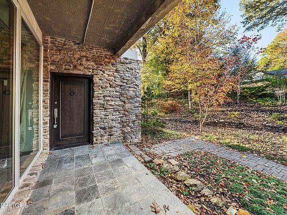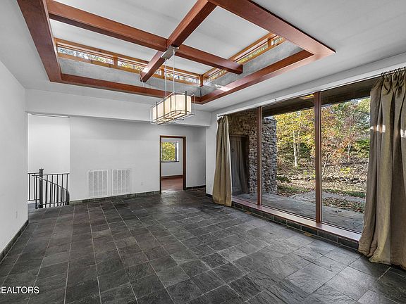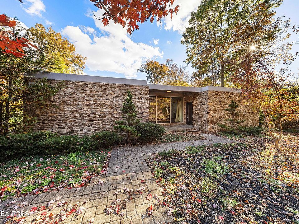 This one-of-a-kind modern delight with hints of Frank Lloyd Wright is located in treasured Sequoyah Hills and offers an incredible opportunity to customize and create your own personal haven while being conveniently located to UT, Downtown, the Bearden District, shopping, dining and more. Crafted of concrete, stone and a stucco veneer, this custom-built home is on the market for the very first time. With oversized windows throughout, the entire home is flooded with natural light and often feels like a private tree house with a host of mature trees surrounding the property. The upper-level formal living space presents with custom wood and slate floors - which continue throughout the home - and a clerestory offering a bit of architectural interest. The formal living space has built-ins and a floor-to-ceiling stack stone gas fireplace that flows into a dining room with large windows. Adjacent to the living/dining spaces is a room overlooking trees that could be used as a guest bedroom, den, or office, and it also has access to the deck. The eat-in kitchen has access to the back deck and offers a large island, stainless high-end appliances, gas cooktop, granite countertops, cherry cabinets and ample space for storage and cooking. The primary bedroom suite is spacious and offers private access to the back deck, a cedar closet and an attached bath with a large vanity and a walk-in shower. The remaining main upper-level bedroom also has an attached bath with a large tub and vanity. Access the basement lower-level via the helical staircase, or the residential elevator. The lower level has lots of additional living space and access to the garage, patio, and backyard. with It includes a den/family room with a stack stone gas fireplace that flows into a secondary kitchen or wet bar area. There's also a laundry room, full bath, and large bedroom suite waiting for your design and personal touches to create a retreat for visiting guests or family members. Located on a wooded lot offering privacy and serenity, this modern home is waiting for you.