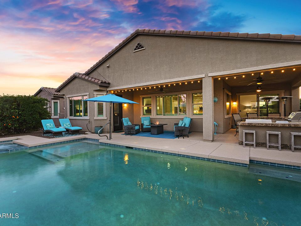 HONEY, STOP THE CAR! This stunning Redding floor plan with a pool and greenbelt views is located in the award-winning active adult community of Province. Truly model-perfect, this home must be seen in person to appreciate its beauty. A charming front courtyard welcomes you—ideal for morning coffee. Inside, enjoy a coffered entry ceiling, modern 12''x24'' tile throughout, and elegant plantation shutters. The gourmet kitchen shines with pristine white cabinetry, quartz countertops, a custom tile backsplash, and a massive island. KitchenAid stainless steel appliances include gas cooking and double ovens, plus a walk-in pantry. This great room split floor plan offers three full bedrooms, each with walk-in closets, plus a custom barn door providing privacy for guest rooms and bath. A versatile den serves as the perfect flex space. The backyard is a true oasis with a built-in outdoor kitchen featuring a grill, griddle, burners, fridge, granite-tile bar top, and ample storage. Enjoy a huge covered patio with three ceiling fans, a gas-heated pool (31' x 14') with Baja shelf and seating bench, and a relaxing hot tub with direct access from the primary suite. Mature landscaping, vinyl fencing with three gates, and extensive upgrades throughout complete this exceptional home. Additional highlights include a patio sun shade, gutters, bird prevention, and a paver sidewalk leading to the side trash enclosure. The home offers a security front door, keyless entry, and a lockbox at the garage. Plush carpeting enhances all bedrooms, while the primary suite features a bay window, dual vanities, and a walk-in closet with a custom organization system. The extended length garage is well equipped with six heavy-duty overhead storage racks and a shelving unit. Enjoy whole-house water filtration with soft water and RO systems, a privacy wall for pool equipment, and a backyard with an orange and lemon tree. Eight-foot doors, pendant island lighting, upgraded fixtures, a laundry room with cabinets, sink, and extra pantry, plus Wi-Fi thermostats, pool controls, garage door, and irrigation system add modern convenience. Conveying items include select bar seating, TVs, courtyard furniture, wrought iron art, outdoor pots, and protective covers for all included outdoor furnishings.