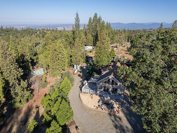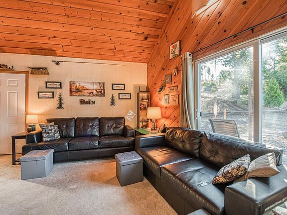 Welcome to this charming 3bed/2bath mountain home on 4.72 wooded acres at the 4600 ft elevation! Outdoors you'll find beautifully landscaped grounds with circular driveway and plenty of parking for RV or boat. Inside you will be greeted with an inviting cabin feel featuring knotty pine finishes throughout and a wall of windows/sliding glass doors from the living & dining areas bringing the outdoors in and providing access to large wrap-around deck. Cozy living room features soaring wood ceilings and a wood burning stove with exposed brick surround. Kitchen is bright and cheery with white appliances, ceramic tile floors and large bay window in adjacent dining area. There are 2 bedrooms and full bath on the main level, plus a large bedroom and bath upstairs, with a nice sized loft to boot! In addition to a double attached garage with roll-up doors, there is also a convenient carport near the front door. Cool temps in the summer with light snow in the winter makes for a great full-time residence or mountain vacation home. Come see!
