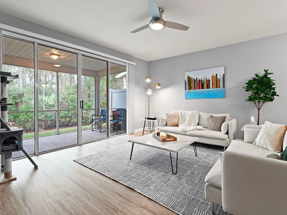 Enjoy the convenience of a responsive landlord and a highly maintained interior, ensuring your living space is always in pristine condition. Relax and unwind in the ceramic flooring-finished screened lanai with unique privacy compared to the other townhomes. The community also includes two fitness centers, two pools, and a kids playground.