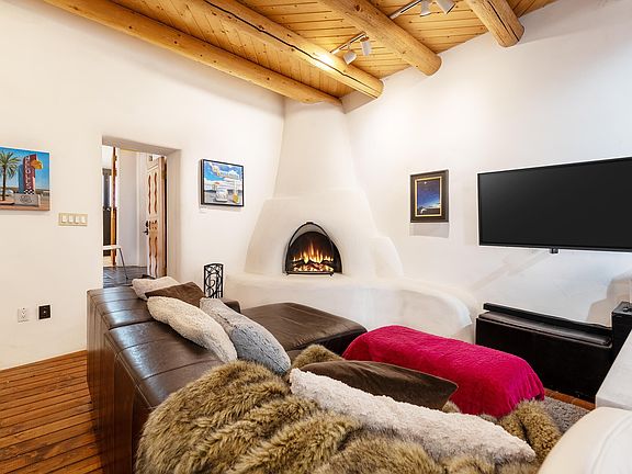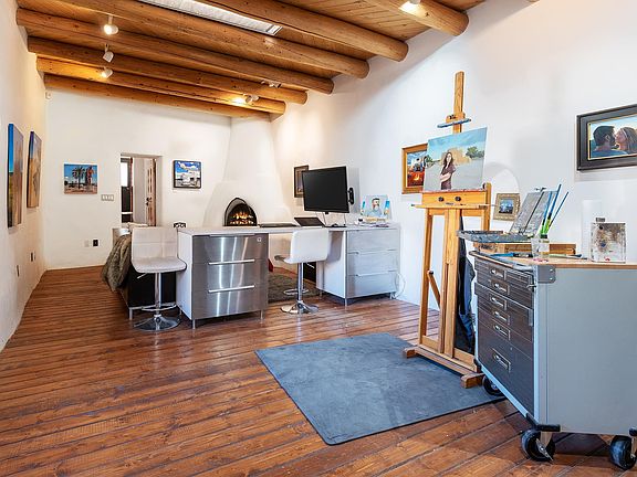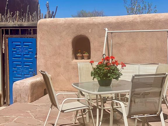 This home is a dream come true if you're looking for an iconic Ranchos adobe! Behind the Blue Door is a walled flagstone patio creating a grand entryway. This 2319 sq ft adobe home has been tastefully renovated and modernized, preserving the original 1930's feel with vigas and tongue and groove ceilings throughout. Saltillo tile floors are warmed by in-floor radiant heat. This home features two distinct living areas. The large, primary living area with wood floors southwestern style fireplace and bancos is currently used as a working artist's studio and gallery with a reception area and private entrance. The other side of the soaring foyer leads to an open living room, warmed by a second fireplace, with dining room and newly renovated kitchen beyond. Double glass doors lead to an enclosed back courtyard ideal for entertaining. The downstairs includes a full bathroom and separate laundry room. Curving wooden stairs adorned with nichos lead to the two bedrooms. The primary bedroom has an attached bathroom and a private deck. A bedroom built-in and a large closet in the hall serve for ample wardrobe space. The third southwestern style fireplace is tucked in the corner of the comfortable guest bedroom. A gated drive-way along the north side of the home takes you to a detached two-car carport and workshop. all on 0.184 acres.