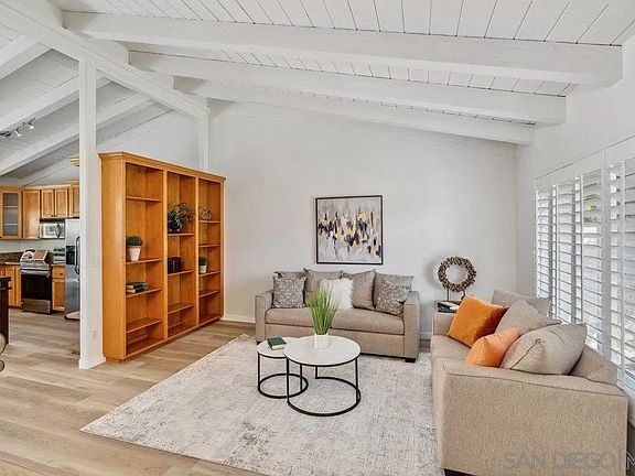 Welcome to 4176 Balboa Way, where the affordability of a condo meets single detached home-style living. This 3 bedroom, 2 full bath, split-level home, with 1766 sq ft of space, offers plenty of room to breathe. Recently revamped, with brand-new light oak luxury vinyl plank flooring underfoot, a clean sweep of White Dove paint throughout the interior, and a kitchen with natural wood shaker cabinets and new matte black hardware. A bold entrance includes a new exterior black pendant light fixture and a new sleek black front door. Enjoy extra privacy in this end-unit home with only one shared wall to the east. Upstairs, you'll find 2 bedrooms including the main bedroom, drenched with southern sun and sunset views to the west, as well as a dedicated vanity shelf, walk-in closet, and upgraded bathroom. The downstairs level includes a large living room with a tile-lined fireplace, a 3rd bedroom with an en-suite bathroom, and side by side in-unit laundry. Adjacent to the open kitchen and dining area, you'll find a large private patio, great for al fresco dining, and two-car enclosed garage. Prime location with Clairemont's best restaurants and convenient bits right outside your front door. Pacific Bluffs is all you'll need for summer fun with a olympic size swimming pool, kids pool, playground, rec room, basketball courts, and more!