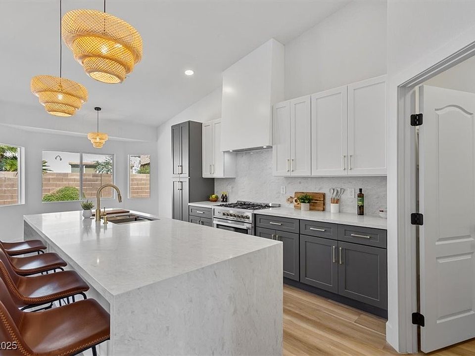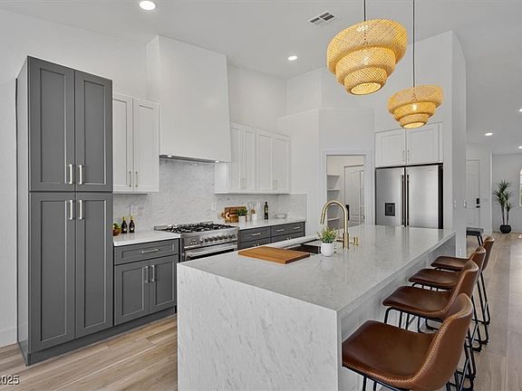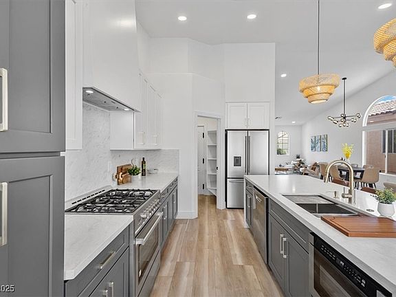 Modern Elegance in a Gated Single-Story | High Ceilings + 3-Car Garage. Beautifully staged 4-bedroom, 2-bath home privately situated on a quiet cul-de-sac, offering style, comfort, and thoughtful design throughout. The open-concept floor plan is enhanced by soaring ceilings and an abundance of natural light that fills every room. Chef’s kitchen is a showpiece, featuring professional-grade stainless steel appliances, quartz countertops, modern cabinetry, and a generous walk-through pantry. The primary suite is a private retreat with a spa-inspired bathroom, boasting a deep soaking tub, a sleek walk-in shower, and dual vanities. A custom beverage bar and reading nook add an extra layer of charm and convenience. Outside, enjoy a low-maintenance backyard with two paved patios and turf. The 3-car garage with durable epoxy flooring for vehicles, storage, or hobbies. Conveniently located near top-rated schools, shopping and dining.