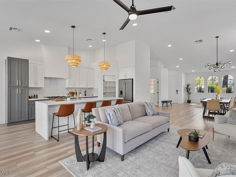 Beautifully staged, move-in ready & thoughtfully upgraded. This 4-bed, 2-bath home sits quietly on a cul-de-sac & offers the blend of modern design & everyday comfort. The open-concept living area feels bright & spacious with soaring ceilings & abundant natural light. The chef’s kitchen stands out with professional-grade stainless steel appliances, quartz countertops, sleek modern cabinetry & a rare walk-through pantry designed for both style & function. The primary suite provides a serene retreat with a spa-inspired bathroom, deep soaking tub & walk-in shower. A custom beverage bar & cozy reading nook add an extra layer of lifestyle luxury. The low-maintenance backyard features two paved patios & turf—ideal for relaxing or entertaining. The 3-car garage has new epoxy flooring & includes a compact car ready for the new owners. Located near top-rated schools, shopping & dining, this home is a must-see for buyers seeking style, comfort & convenience in a prime Las Vegas location.
