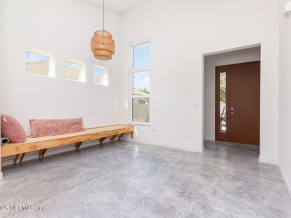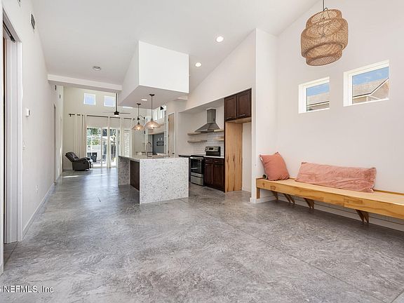 Amazing opportunity in the desirable Cedarbrook community! This unique, modern home offers soaring ceilings, expansive windows, and an abundance of natural light. The polished concrete floors throughout create a modern look built to last. The stunning kitchen features quartz countertops with a waterfall-edge island, open shelving, and a total open-concept design perfect for entertaining. Triple sliding glass doors extend your living space onto a private backyard patio retreat. A brand-new AC (2024) adds peace of mind, and motorized window blinds in all the bedrooms and a few in the open living areas enhance the home's sleek, minimalist style. Truly a one-of-a-kind property you won't want to miss!
