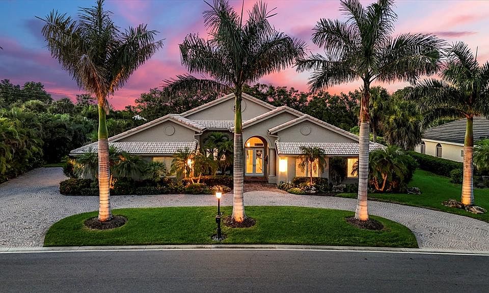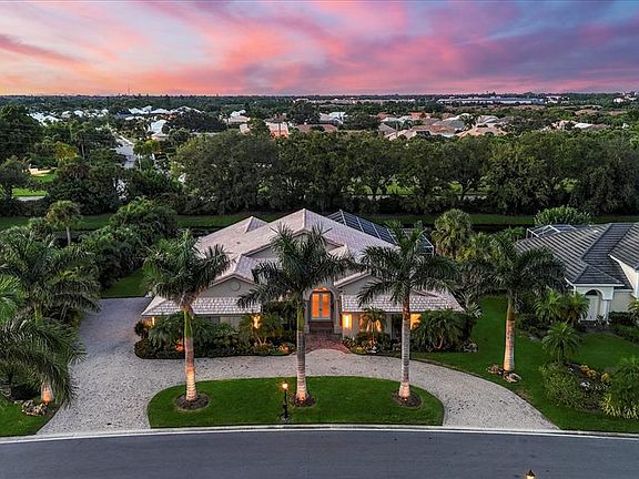 Set among soaring palms in the heart of The Estates of Prestancia, this 4-bedroom, 3-bath residence combines timeless curb appeal with a thoughtfully reimagined interior. A circular paver drive leads to a double-door entry, where high ceilings and open sightlines immediately introduce the home’s seamless connection to the lanai, pool, and water views beyond. Spanning 3,669 square feet, the home blends modern upgrades with effortless livability. Porcelain tile runs throughout, complementing dramatic ceiling heights and expansive entertaining spaces. The formal living room is anchored by a striking 100" LED fireplace, while adjoining the dining area and family room, offering a natural open flow into the heart of the home, a custom kitchen by Sheldon Campbell. Designed with entertaining in mind, the kitchen features central and serving islands, abundant storage, wall oven and microwave, a paneled refrigerator, a mirrored backsplash, a wine refrigerator, and an airy dining space overlooking the pool. The split-plan primary suite offers a private retreat with lanai access, vaulted ceilings, and polished tile floors, alongside a spa-like bath with dual vanities, a frameless glass shower with rainfall and handheld sprayers, and a dedicated tankless water heater. A hidden-entry guest suite with lanai access and en-suite bath provides a unique private haven, while two additional guest bedrooms share a bright, well-appointed bath. An office with built-ins, a spacious laundry room, and ample storage complete the interior. Outdoors, a resort-style lanai invites year-round living with imported shell stone pavers, a heated saltwater pool, an elevated spa, a sundeck, and a fully equipped outdoor kitchen. Lush landscaping creates privacy, while updates, including impact glass, two newer HVAC systems, a generator, irrigation, and drainage upgrades, and fresh paint inside and out, ensure peace of mind. A side-entry two-car garage completes the offering. In Prestancia, residents enjoy optional TPC memberships with golf and social opportunities, plus convenient access to The Legacy Trail, Siesta Key Beach, downtown Sarasota, St. Armands Circle, and the barrier islands. Blending thoughtful renovations, custom details, and seamless indoor-outdoor living, this Prestancia estate offers a move-in-ready lifestyle in one of Sarasota’s premier gated golf communities.