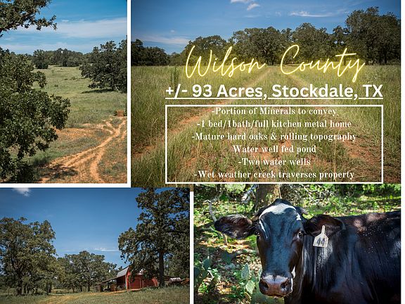 93.07 acres of land for sale (WITH MINERALS)!! The property consists of two tracts, a 55 acre tract and a 38.07 acre tract in Wilson County, located approximately 7 miles east of Stockdale, Texas. This land is both fenced and cross-fenced, has one water well per tract (2 wells), is heavily treed with mature oaks and native brush throughout, offers a great variety of land use, to include cattle, hunting and recreation, has a mixture of level, sloping and rolling topography, is under agricultural valuation and lies partially within a flood zone, as Steel Branch Creek traverses the front tract of the total acreage. Surrounded by oak and Spanish oak trees lies a small metal barndominium with central air and heat, one bedroom, living room, full kitchen and bathroom. The tract with barn also features a water-well fed pond and cattle troughs. Hunting for deer, turkey, wild pigs, and dove to name a few. Seller will convey 1/4 of any royalty interest owned. The interest is non-participating. Fully fenced and cross-fenced Access easement to property off of Farm to Market Rd Pond 2 Water wells in place Mature oaks Steel Branch Creek traverses property Variety of land use - cattle, hunting, recreation, horse, etc. Large neighbors Abundant in game, including deer, dove, hogs, turkey and quail Electric on site Ag Valuation in place Barndominium in place Approx 46 miles from SA Approx 20 miles from Floresville Approx 35 miles from Kenedy