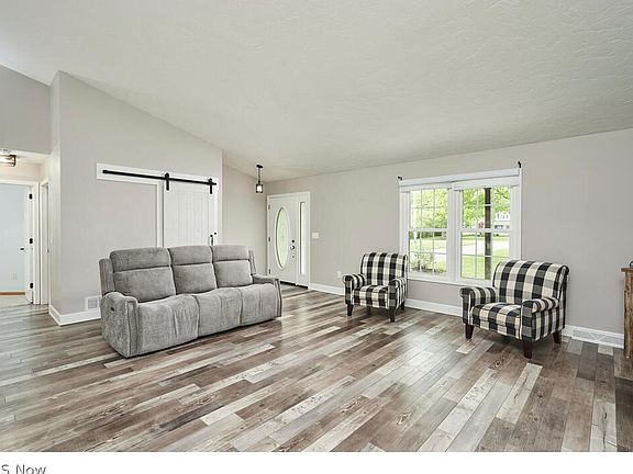 Welcome to modernized country living on one floor in Carlisle Township! This 3 BR 2.5BA ranch sits on nearly an acre and features an open concept eat-in kitchen and living room w/ vaulted ceilings, kitchen w/ SS appliances & slider to rear patio and backyard, and living room with wood-burning fireplace, master suite w/ walk-in & 2nd closet and spacious private bath, 2 add’l bedrooms w/ new carpet (’22) & full bath on opposite side of home, guest half bath, and laundry room. Home also features a partially finished full basement, charming covered front porch, 2 car attached garage, 26'x20' pole barn/outbuilding w/ 2 bays ('22), new vinyl windows ('23), and a fully fenced-in backyard ('22). Conveniently located < 10 min drive from LaGrange, Oberlin, and Grafton.