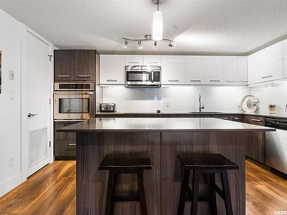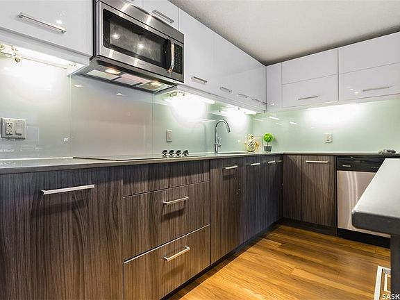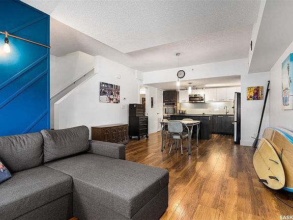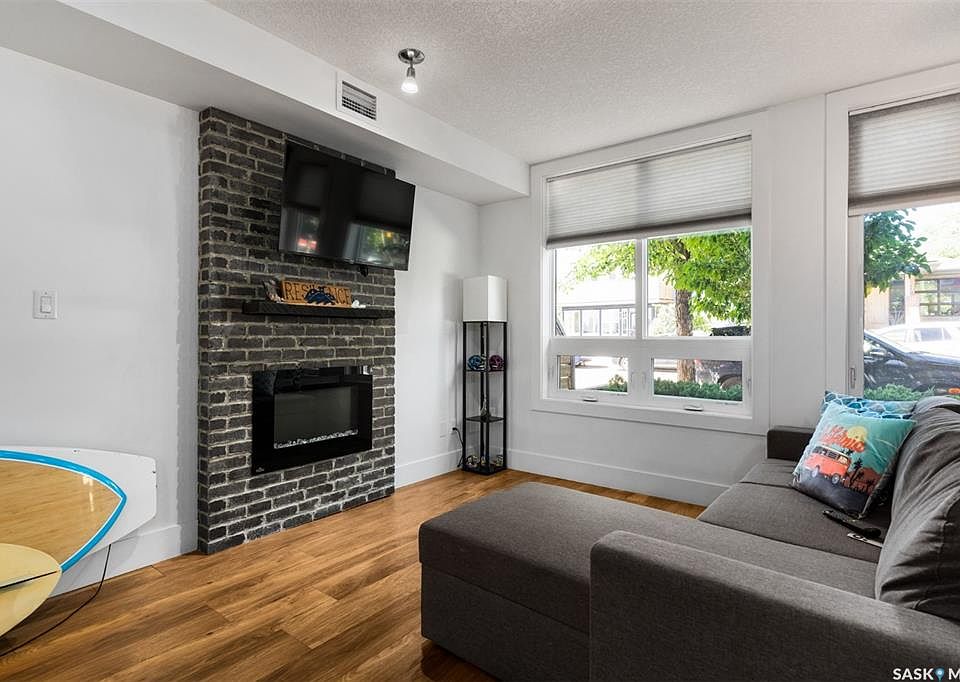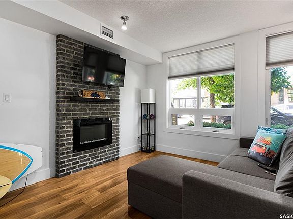 Enjoy downtown living in this newer, modern townhome located steps to the river. Well constructed and completed in 2017, this home is part of the popular Banks complex. Featuring 2 bedrooms, 3 bathrooms, an open concept layout on the main floor with lots of cabinetry and quartz countertops as well as stainless steel appliances, a Napoleon fireplace with new surround in the living room, a concrete feature wall and a two piece modern bath. Upstairs you will find a three piece bath with tiled shower and glass door, a Bosch washer and dryer, spacious primary bedroom with 4 piece en-suite and an additional bedroom both with balcony doors leading to a covered deck overlooking Avenue C. Brand new carpet throughout the upstairs and on the staircase. The townhome comes with TWO titled, heated underground side-by-side stalls and a storage unit. Other features include central air, natural gas hook-up for bbq, underground parking for your guests, rooftop deck and bike room. With only a few of these two-story style townhomes built, this is definitely a rare find. Enjoy the convenient location with many amenities close by including the newest restaurants, boutique shops and coffee spots.